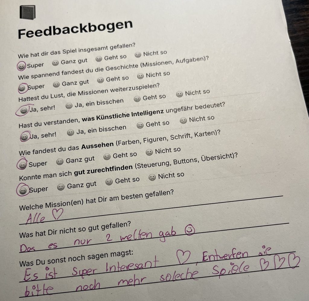 Der Feedbackbogen links zeigt, wo es hingehen soll: Die Kinder wollen mehr Welten und Spiele!